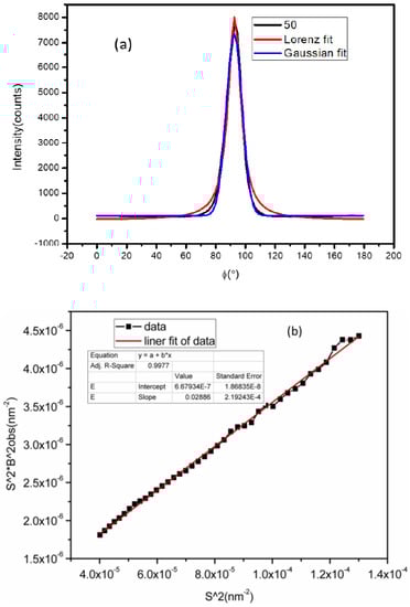 In Figure 3, an example of such an intensity distribution is shown as a function of the angle ϕ with respect to the principal axis. The azimuthal angle is approximately fitted with a Gaussian distribution rather than Lorentz distribution to estimate the full width at half maximum Bobs. The microfibril length (Lf) and disorientation width (B) can be obtained using Equation (4)