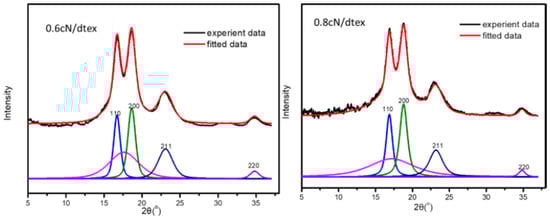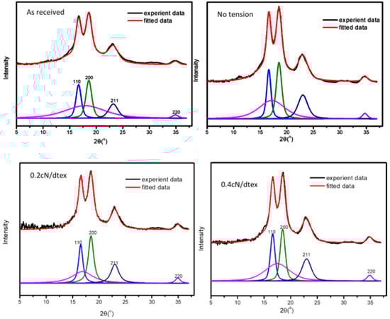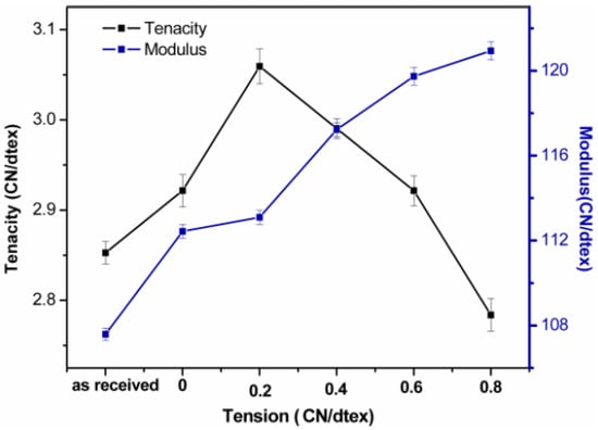 As we know, the perfection and orientation of the crystallites are responsible for their mechanical properties [33]. The modulus of the fibers in Figure 5 is consistent with the crystallinity and orientation as shown in Figure 8. Clearly, the increased crystal perfection under tension in scCO2 seems to be the cause for the chain alignment and an increase in the modulus while the number of defects is decreased. Moreover, the increase in the intermolecular force due to crosslinking with TDI could improve the tensile strength. However, the crystallites and orientation at the 0.8 cN/dtex tension was less than at the 0.6 cN/dtex tension, which may be because the higher tension would make fibrils broken and less oriented. The crystallite sizes of the (110) and (210) planes were larger, under a higher tension, which is useful for perfection of the crystallites, so the modulus is larger.