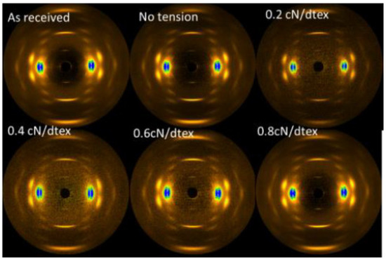 The degree of orientation and length of the fibril is listed in Table 1. Compared with the as-received fibers, the fibers are treated in scCO2 with TDI and without tension, and here are increases in the orientation and correlation length. This result is consistent with the infiltration and crosslinking of a fiber by TDI and the rearrangement of the molecular chains, which will decrease the volume. When the tension is applied, the disorientation of the fibers treated in scCO2 decreased under tension by less than 0.6 cN/dex, indicating an increase in the orientation of the microfibrils. However, the length of a microfibril is slightly lower. This reason is that the microfibrils existing between the loosely connected networks of microfibrillar structures are compressed and oriented with the plasticization of scCO2. In addition, there is a decrease in the misorientation width of the microfibrils in the fibers treated in scCO2 under tension. This may be because the externally applied tensile force will have a stronger effect in the amorphous regions due to their higher mobility since the chains establish a more extended and more densely packed state, decreasing the scattered intensity.