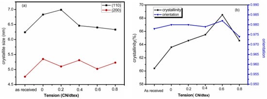 The crystallinity of fibers, crystalline orientation and apparent crystal size of the (110) and (200) peaks of the Kevlar 49 fibers are shown in Figure 8a,b. It is evident that the crystallinity of the fibers after treatment in scCO2 mostly increases with increasing tension, indicating that the crystallites region is perfected. The crystallite sizes of the (110) and (200) planes of fibers increase with tension. However, this does not depend on the tension. A tension less than 0.2 cN/dtex, the size of (110) is increased, which indicated that the crystals growing along this direction were increased under tension. However, as some crystals grow with the reorganization in scCO2, some crystals might be destroyed at a high tension. The increase in the crystal size also indicates the perfection of the crystallites as the crystals grow.