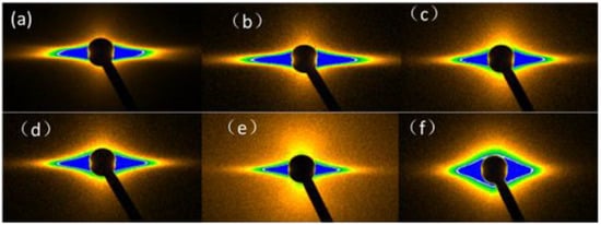 Small-angle X-ray scattering (SAXS) patterns for Kevlar49 fibers treated in different conditions (a)—as received, (b–f)—treated in scCO2 with toluene 2,4-diisocyanate (TDI) under various tensions 0, 0.2, 0.4, 0.6, 0.8 cN/dtex.