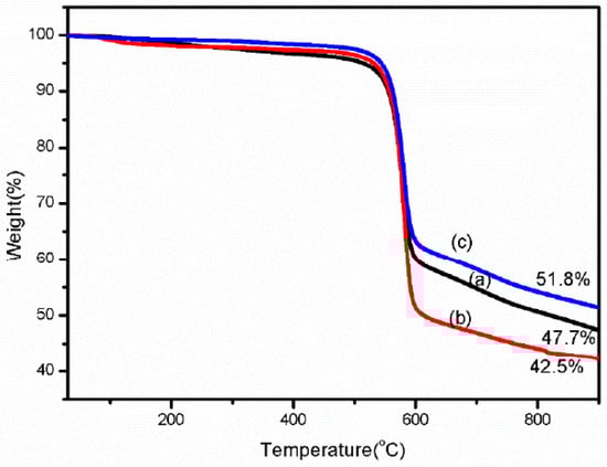 We studied the thermal stability of the fibers by thermogravimetric analysis (TGA). From Figure 10, the thermal stability of the Kevlar 49 fiber treated with TDI under a tension of 0.6 cN/dtex (c) is clearly better than the fiber that was only treated in scCO2 and without tension (b) and that of the as received fiber (a). From the curves of Figure 9, these fibers show a high stability, as they did not undergo intensive decomposition until 470–580 °C in a nitrogen atmosphere. At this temperature range most likely corresponding to the thermal decomposition of the polymer. Both the thermal stability of the fibers treated in scCO2 with or without tension are improved at the 550–580 °C. Moreover, at temperatures above 800 °C, the sample mass loss reaches a nearly constant value which corresponds to the carbon ash content of the sample. The residual mass of the fiber treated in scCO2 under a tension of 0.6 cN/dtex is obviously higher than that of untreated fiber and only treated in scCO2 without tension. Thermal degradation of fiber starts from skin to core [13], when the fiber treated in scCO2 with TDI, the skin surface and amorphous region were enhanced due to the more regular arrangement of the molecules and the higher crystallinity, which corresponding to the results of Figure 4. For the fibers treated in scCO2 under tension, the internal crosslinking reaction between TDI and more hydrogen of the amide bond of the fiber, the intermolecular force improves, resulting in an improved heat resistance and residual mass. Moreover, the residual content of the fiber only treated in scCO2 is lower, which may be because the impurities or the moisture was reduced by the purification of scCO2.