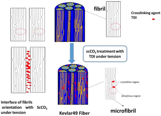 Based on the results and discussions above, a model of the progress and structure change is shown in Figure 11. The Kevlar 49 fiber is comprised of fibrils that are 100 nm−2 μm in diameter, which, in turn, are comprised of microfibrils, with a diameter of ~100 nm and length of 500–1200 nm. The microfibril was comprised of a large perfectly oriented crystallite phase and irregular amorphous phase. The amorphous phase has a less regular macromolecule with some chain end or defects, which exist between the crystallites or at fibril interfaces. With the help of swelling the scCO2, TDI was dissolved and impregnated the fiber. Crosslinking reaction of TDI with the chain end in the amorphous phase between the interfaces of the fibril will adhere to the fibrillar elements and provide a secondary inter-fibrillar force. With the plasticization of scCO2 and tension, the mobility of rigid segment of macromolecular chain is improved, allowing it to be packed more regularly, and the rearrangement of amorphous region, resulting in the perfection of the crystallization with a higher crystallite, orientation, which is useful for improving the mechanical properties.