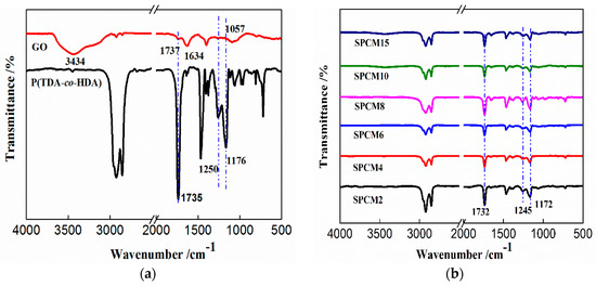 FTIR spectra of the P(TDA-co-HDA) and SPCMs are shown in Figure 1.Characteristic bands of GO appeared at 3434 cm−1 (C–OH stretching), 1737 cm−1 (C=O stretching), 1634 cm−1 (C=C stretching vibration), and 1057 cm−1 (C–O of epoxy stretching). For P(TDA-co-HDA), characteristic bands were present at 1737 cm−1 (C=O stretching) and 1250 and 1176 cm−1 (C–C stretching of the alkyl chain in P(TDA-co-HDA)). In the spectra of the SPCMs, the majority of the absorption peaks of the primary functional groups of P(TDA-co-HDA) and GO also appeared, which had a slight shift in the peak positions, which proved that the SPCMs were successfully obtained.