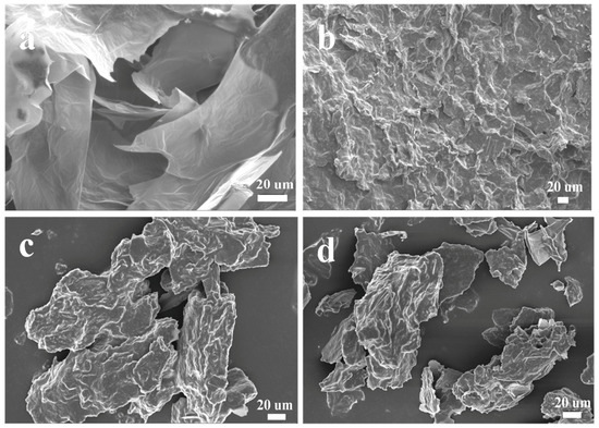 Scanning electron microscopy (SEM) micrographs of (a) GO, (b) SPCM8, (c) SPCM10, and (d) SPCM15.