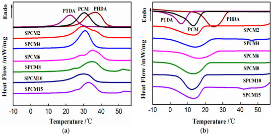 Curves of poly(tetradecyl acrylate) (PTDA), poly(hexadecyl acrylate) (PHDA), P(TDA-co-HDA), and the SPCMs during the (a) heating and (b) cooling processes.
