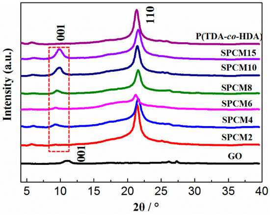 X-ray diffraction (XRD) patterns of GO, P(TDA-co-HDA), and the SPCMs.