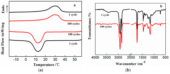 The thermal reliability and cycling stability of a PCM are considered to be important parameters for thermal energy storage applications. For SPCM10, as an example, after one and 100 thermal cycles, the thermal reliabilities and structural stabilities were compared. The DSC curves and FTIR spectra of SPCM10 are shown in Figure 8a,b, respectively. The detailed calorimetric data are summarized in Table 2. No changes were found in Figure 8a after one and 100 thermal cycles, which proved that SPCM10 possessed good thermal reliability. The Tm, Tc, ΔHm, and ΔHc values of SPCM10 were nearly the same before and after 100 thermal cycles, as shown in Table 2. Although the data exhibited a slight change, these changes were negligible for thermal energy storage applications. The results demonstrated that the fabricated SPCMs also possessed good thermal reliabilities. Moreover, no structural changes were detected after the thermal cycling, as shown in Figure 8b. This indicated that the SPCMs possessed good structural stabilities, which would allow them to be used as shape-stabilized thermal energy storage materials.