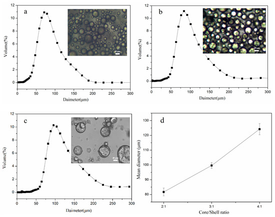 The size distributions and OM images of TO-loaded microcapsules with a core/shell ratio of (a) 2:1, (b) 3:1, and (c) 4:1, and (d) mean diameter of microcapsules with different core/shell mass ratios.