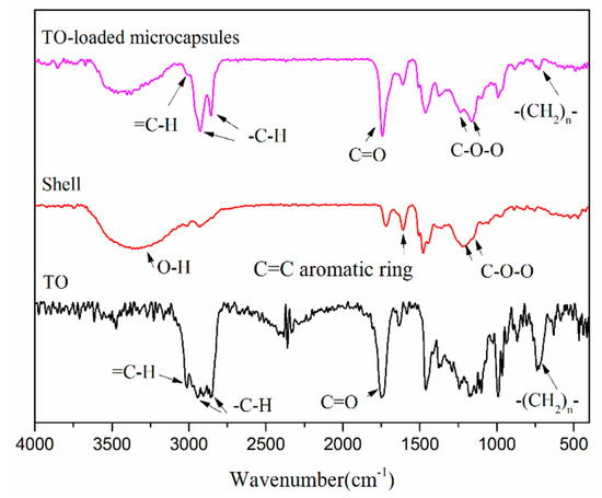Figure 4 exhibits the infrared spectra of the TO core and TO-loaded microcapsules (core/shell ratio of 3:1), and the shells of the microcapsules. The spectra of the TO core and microcapsules shown in Figure 4 contained stretching vibration peaks of =CH at 3012 cm−1, stretching vibration peaks of C-H at 2927 cm−1 and 2855 cm−1, stretching vibration peaks of C=O at 1745 cm−1, and bending vibration peaks of -(CH2)n- (n ≥ 4) at 725 cm−1. These peaks indicated the TO core was successfully encapsulated and remained effective by retaining its original functional groups. Furthermore, the shell spectrum contained a wide stretching peak of O-H at 3368 cm−1, a stretching peak of C=C in aromatic ring at 1606 cm−1, a characteristic peak of phenolic hydroxyl group at 1385 cm−1, and stretching vibration peaks of ether bond C-O-C at 1259 cm−1 and 1163 cm−1. The presence of these peaks confirmed that the shell had both PF and PGMA components.