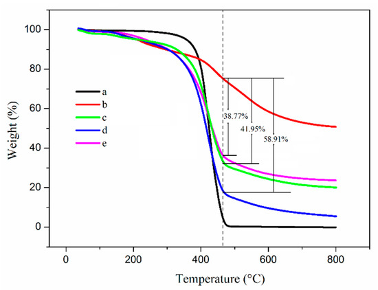 TGA curves of (a) TO, (b) shell, and TO-loaded microcapsules with core/shell ratios of (c) 2:1, (d) 3:1, and (e) 4:1.