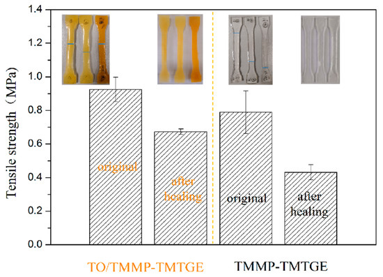 Tensile strengths of the TMMP-TMTGE self-healing material and TO/TMMP-TMTGE self-healing composite before and after healing.