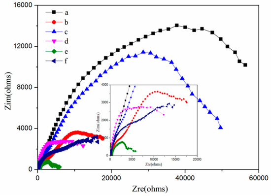 As shown in Figure 11, the original state of the TO/TMMP-TMTGE had a higher arc radius than the original state of the TMMP-TMTGE, indicating that the filling of the TO-loaded microcapsules hindered penetration of the electrolyte. Moreover, the arc radius of the TO/TMMP-TMTGE after healing was three times the radius of the arc after scratching. However, after healing, the arc radius of the TMMP-TMTGE showed only a slight increase compared with after scratching. In addition, the arc radius of the TO/TMMP-TMTGE after healing was significantly larger than the radius of the TMMP-TMTGE after healing, which confirmed that the cracks were healed in both systems. Furthermore, the TO/TMMP-TMTGE double-healing system was superior to the TMMP-TMTGE intrinsic healing system, due to the combination of the double-healing and barrier effects.