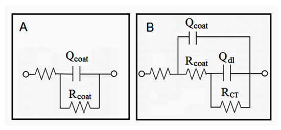 In the models, Rcoat is the coating resistance, RCT is the charge transfer resistance, and Qcoat is the constant phase angle element related to the capacitance of the electrical double layer formed between the electrolyte solution and the surface of the coatings. Qdl is the constant phase angle element related to the capacitance of the electrical double layer formed between the electrolyte solution and the surface of the base metal. These parameters correspond to the two models listed in Table S1.