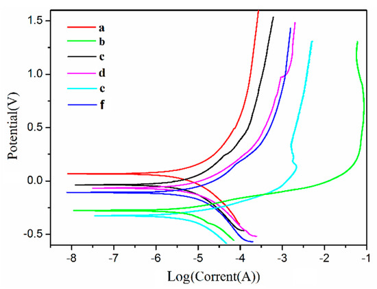 Tafel curves of the TO/TMMP-TMTGE self-healing coating material (a) in the original state, and after (b) scratching and (c) healing, and the TMMP-TMTGE self-healing coating material (d) in the original state, and after (e) scratching and (f) healing.