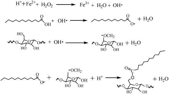 The reaction process of esterification and grafting modification of nanocellulose with fatty acids is shown in Figure 1. Hydroxyl radicals can be produced by H2O2 and FeSO4 in the reaction system. Hydroxyl radicals can capture hydrogen atoms on fatty acids and NCC to form water, fatty acid radicals, and NCC radicals, respectively [20,21,22]. Fatty acid radicals and NCC radicals can be esterified to obtain MNCC [22].