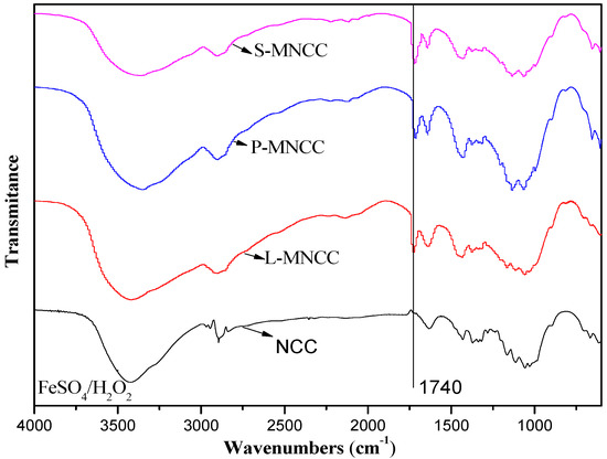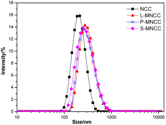Figure 4 showed that the average particle size of MNCC, which was modified by fatty acids, was slightly increased than NCC. The average particle size, the particle size distribution coefficient, and the specific surface area were 168 nm, 0.255, and 19,260 m2/kg, respectively, for NCC; 255 nm, 0.297, and 17,500 m2/kg, respectively, for L-MNCC; 244 nm, 0.308, and 17,400 m2/kg, respectively, for P-MNCC; and 247 nm, 0.319, and 17,430 m2/kg for S-MNCC. The difference of particle size, the particle size distribution coefficient, and the specific surface area of L-MNCC, P-MNCC, and S-MNCC were very small. The particle size of MNCC were slightly different from that of NCC, likely because the molecular weight of MNCC increased slightly after the hydrophobic group was grafted, so the particle size of MNCC increased slightly. Although the particle size of MNCC was slightly increased, the particle size was still in a nanometer range. Moreover, the distribution coefficient of the particle size of MNCC was larger than that of NCC, which indicates that the particle size distribution of MNCC was wide, and a certain degree of flocculation occurred during the reaction of fatty-acid-grafted NCC. The particles of MNCC were enlarged, and the specific surface area of MNCC was reduced relative to that of NCC. After being grafted with long-chain fatty acids, NCC reactivity was reduced to some extent. In summary, the average particle size of grafted NCC was 244 to 255 nm, which was not a large increase relative to that of NCC. The particle size remained at the nanometer scale and had a large specific surface area.