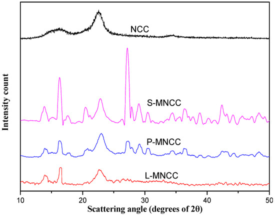 Figure 3 provides a comparison of the XRD images of NCC with those of L-MNCC, P-MMCC, and S-MNCC, which was prepared by using FeSO4/H2O2 system as an initiator. The L-MNCC, P-MNCC, and S-MNCC exhibited diffraction peaks at I002 (2θ = 22.58°), Iam (2θ = 16.38°), and I004 (2θ = 34.54°), respectively, which indicated that the FeSO4/H2O2 system successfully initiated the NCC grafting reaction. Furthermore, the basic crystal structure of the NCC was also maintained [23]. The XRD image of the L-MNCC was substantially similar to that of NCC, and the crystal structure did not remarkably change. The XRD images of P-MNCC and S-MNCC showed diffraction peaks at other positions and changed the crystal structure. This phenomenon occurred because the palmitic acid and stearic acid have a longer carbon chain structure than lauric acid. The steric hindrance was large, and the crystal structure of NCC was slightly changed after the grafting at NCC [20,23].