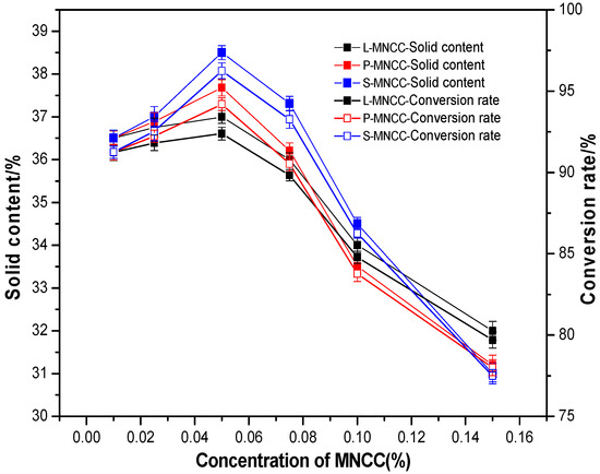Certain amounts of L-MNCC, P-MNCC, and S-MNCC were weighed and added to deionized water and dispersed by ultrasound for 30 min. Styrene-acrylic emulsion polymerization was then conducted, according to the proportion shown in Table 1, and the solid content and conversion rate of the emulsion obtained were calculated. The test results are shown in the following figure.