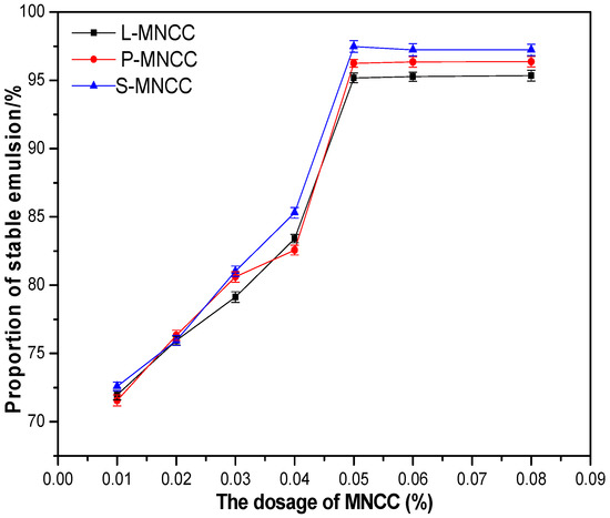 Figure 6 showed that, when the dosage of MNCC was less than 0.05%, the particle size of the emulsion gradually decreased with the increase of the dosage of MNCC. When the dosage of MNCC was 0.05%, the emulsion particle size was stable at approximately 460 nm. With the increase of the dosage of MNCC, the emulsion particle size did not change. When the concentration of MNCC was small, the dispersion and emulsifying ability of MNCC was weak, and the stable emulsion could not be formed. As a result, droplets tend to aggregate, and the size of the emulsion formed was larger. When the concentration of MNCC increased, its emulsifying and dispersing ability increased. Hence, the aggregation of emulsion decreased, and the particle size of the emulsion decreased. When the dosage of MNCC reached 0.05%, MNCC could play a good emulsifying function, which could form micelles better and form stable emulsion. When the dosage of MNCC was greater than 0.05%, the effect of MNCC concentration on emulsion micelles decreased. MNCC was only dispersed in the emulsion. Hence, the particle size of the emulsion no longer changed. The three modified products of L-MNCC, P-MNCC, and S-MNCC had a little effect on the particle size of emulsion. When the emulsion was stable, the particle size of the emulsion was approximately 460 nm. The difference among the three modified products was reflected in the carbon chain length and hydrophobicity of hydrophobic groups. The formation of emulsion droplets was encapsulated by MNCC droplets, and the structure of the three modified products was not very different. Therefore, the particle size difference between the three modified products as surfactants was almost absent. Moreover, when the MNCC dosage was 0.05%, the particle size distribution coefficients particle size distribution coefficient of the emulsion were 0.297, 0.319, and 0.308, respectively. A small particle size distribution coefficient value indicates uniform particle size distribution. Therefore, a narrow distribution indicates the uniform particle size of emulsion. In summary, when the dosage of L-MNCC, P-MNCC, and S-MNCC was 0.05%, the particle size of emulsion was the smallest at 460 nm.