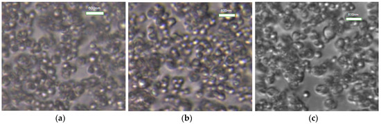 Optical microscopy of styrene-acrylic emulsion stabilized by MNCC. (a) L-MNCC, (b) P-MNCC, and (c) S-MNCC.