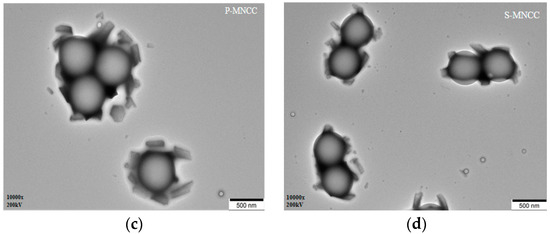 A blank styrene-acrylic emulsion (the preparation method was shown at Section 2.2.4, but no MNCC was added) and a styrene-acrylic emulsion containing different contents of L-MNCC, P-MNCC, and S-MNCC were diluted into a translucent liquid. A small amount of diluted emulsion was obtained and dropped on the copper net to let it dry naturally. The morphology of the styrene–acrylic emulsion droplets was then observed using a transmission electron microscope. The test results were as follows.