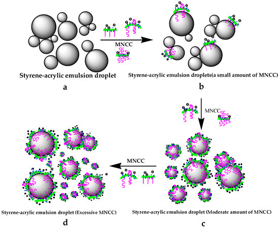 Figure 11 showed that the particle size distribution of the styrene-acrylic emulsion droplets was not uniform, and the emulsion droplets of different sizes and sizes were easily aggregated when MNCC was not added (Figure 11a). The styrene-acrylic emulsion formed was unstable and was easily affected by external influences causing coalescence, instability, or flocculation at this time. Considering that MNCC had a certain hydrophilic and lipophilic ability, the hydrophilic group of the MNCC would cling to water, and the lipophilic group composed of the hydrophobic hydrocarbon long chain would extend to the inside of the droplet. Thereby, MNCC was adsorbed on the surface of the styrene–acrylic emulsion droplets (Figure 11b). However, the coating of the styrene-acrylic emulsion droplets could not be formed when the content of MNCC was small. Therefore, the stability was still not good, even though the stability of the styrene-acrylic emulsion at this time was improved to some extent. The MNCC could completely form the droplets of the styrene-acrylic emulsion when the concentration of MNCC reached a certain amount (Figure 11c). The contact between the droplets of the styrene-acrylic emulsion was greatly reduced, so the formed emulsion was further stabilized. Due to the hydroxyl structure on the surface of the MNCC, the surface of the MNCC exhibited negative electrons. Hence, the droplets and droplets were less likely to contact and aggregate due to electrostatic repulsion. Styrene-acrylic emulsions exhibited high stability. The excess MNCC existed in the aqueous phase in the form of micelles when the MNCC content continued to increase (Figure 11d).
