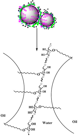 Hydrophobically modified NCC could stabilize emulsions because its hydrophilic lipophilic property allows good adsorption on oil-water surfaces [13]. Stark [14] et al. chemically modified NCC using rapeseed oil fatty acid methyl ester through transesterification to obtain a modified NCC that had certain hydrophobicity and could be combined with polylactic acid in nano-materials with good plasticizing effect. Cunha [15] et al. surface modified NCC with chemically modified lauryl chloride to endow the NCC with a hydrophobic property and decreased hydrophilicity. They also proved that the modified NCC could stabilize the oil in water emulsion without surfactants. Many researchers also provided the mechanism for hydrophobically modified NCC stabilized emulsion. On the one hand, Hydrophobic groups of hydrophobic modified nanofibers extend into the interior of microemulsions, and hydrophobic groups associate with each other to induce thickening. Additionally, the elastic 3D network structure formation, which effectively inhibits emulsion flocculation [16,17,18]. On the other hand, the hydrophilic part of the nanocellulose chain greatly increased its solubility in water and enhances its dispersion in aqueous solution [16]. Therefore, the hydrophobic-modified NCC could be used as a stabilizer and emulsifier and had incomparable advantages over small molecular surfactants. The application of modified NCC instead of traditional surfactants in emulsion stabilization could expand the application scope of biomass resources, reduce the dependence on petrochemical products, and contribute to the protection of the environment [9,19].