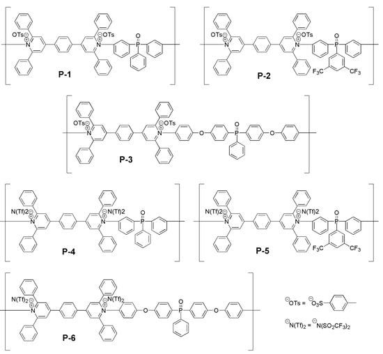Using a similar metathesis reaction, ionic polymer P-5 was prepared from ionic polymer P-2. First, 1.40 g (1.08 mmol) of P-2 was dissolved in 50 mL of DMSO. Then, lithium triflimide (0.73 g, 2.28 mmol) was added to the DMSO solution of this polymer. The resulting solution was kept at 50 °C for 48 h. After reducing the DMSO solution by a rotary evaporator, the reaction mixture was added to distilled water, affording the desired ionic polymer P-5. It was collected by vacuum filtration and washed several times with a large quantity of hot distilled water. This procedure was repeated once more; then, the collected polymer was dried in vacuum at 100 °C for 72 h and weighted to give 1.54 g (1.02 mmol) of polymer P-5. Unfortunately, the 1H NMR spectrum of this polymer showed a pair of doublets [δ = 7.09 (d) and 7.46 ppm (d)], suggesting the incomplete exchange of tosylate ions by triflimide ions. To complete the exchange of tosylate ions to produce polymer P-5, a metathesis reaction was carried out for the third time yielding the successful metathesis reaction. Using the identical procedure, ionic polymer P-6 was prepared by the metathesis reaction of P-3 with lithium triflimide in DMSO. The chemical structures and purities of ionic polymers P-5 and P-6 were confirmed by elemental, 1H, and 13C NMR spectra analyses (see Supplementary Materials). Elemental analysis for polymer P-5, Anal. Calcd. for C64H39N4O9F18S4P (1509.23): C 50.93, H 2.60, N 3.71, S 8.50; found: C 50.26, H 2.71, N 3.75, S 10.25. Elemental analysis for polymer P-6, Anal. Calcd. for C74H49N4O11F12S4P (1557.43): C 57.07, H 3.17, N 3.60, S 8.23; found: C 54.57, H 3.77, N 3.55, S 8.88.