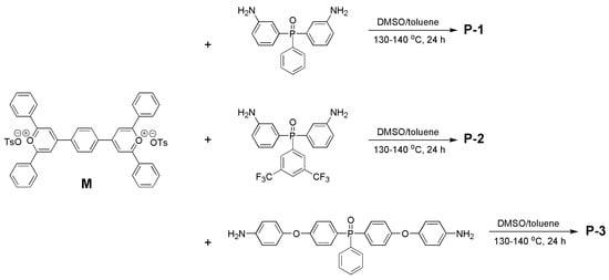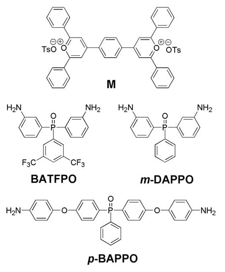 Chemical structures of 4,4′-(1,4-phenylene)-bis(2,6-diphenylpyrylium) ditosylate monomer (M), and phosphine oxide containing diamines, bis(3-aminophenyl)phenyl phosphine oxide (m-DAPPO), bis(3-aminophenyl)-3,5-bis(trifluoromethyl)phenyl phosphine oxide (BATFPO), and bis(4-aminophenoxy-4-phenyl) phenyl phosphine oxide (p-BAPPO).