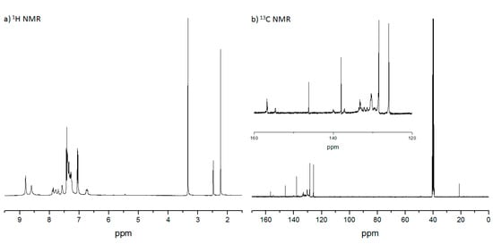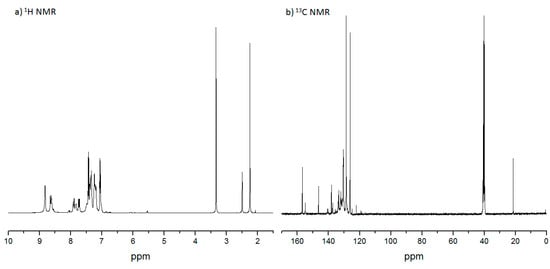 The phenyl phosphine oxide-containing poly(4,4′-(p-phenylene)-bis(2,6-diphenylpyridinium)) ionic polymer (P-1) was prepared by a ring-transmutation polymerization reaction (Scheme 5) [42,43,44,45,46,47,48,49,50,51,52,53,54,55,56,57,58]. This polymerization reaction was essentially a polycondensation reaction between 4,4′-(1,4-phenylene)-bis(2,6-diphenylpyrylium) ditosylate monomer (M) and bis(3-aminophenyl)phenyl phosphine oxide (m-DAPPO) liberating water as a condensation product. M was polymerized with m-DAPPO simply on heating in non-volatile, non-toxic, water-miscible solvent dimethyl sulfoxide (DMSO) at 130–140 °C for 24 h. Regarding the water, the condensation product that was generated during the polymerization reaction was distilled out from the reaction medium as a toluene/water azeotrope. The yellowish solid ionic polymer P-1 was isolated by two cycles of precipitation with distilled water and dissolution in methanol. Its yield of 77–80% with high purity was achieved after purification. It should be noted that the reaction medium was maintained as a homogeneous solution throughout the entire polymerization reaction period, thus permitting the production of a high molecular weight polymer. This polycondensation reaction was essentially in contrast to other polycondensation reactions in which polymers usually precipitate out of solutions prematurely, thus limiting the maximum molecular weights of the polymers. Polymer P-1 was fully characterized by elemental analysis, 1H and 13C NMR, and gel permeation chromatography (GPC) analyses. Figure 3 shows the 1H and 13C NMR spectra of ionic polymer P-1 in d6-DMSO at room temperature. Its 1H NMR spectrum showed unique resonances at δ = 8.93 and 8.70 ppm for the protons of the aromatic moieties of bispyridinium salts and a set of resonances at δ = 7.44 and 7.05 ppm and 2.25 ppm for the protons of the aromatic moiety and methyl group in the tosylate counterion. The relative integration ratio of all the aromatic protons (49H) and the aliphatic protons (6H) is in excellent agreement with the calculated value obtained from those in the repeating unit of this polymer. Its 13C NMR spectrum contained both aliphatic and aromatic carbon signals at appropriate chemical shifts, as expected. Using similar ring-transmutation polymerization reaction (Scheme 5) and purification processes, ionic polymers P-2 and P-3 were obtained by polymerizing M with the corresponding diamines (BATFPO and p-BAPPO) in DMSO at 130–140 °C for 24 h with yields of 77% (yellow solid) and 79% (dark brown solid), respectively. The chemical structures of both the ionic polymers P-2 and P-3 were also confirmed by elemental, 1H, and 13C NMR spectra analyses. Figure 4 shows the 1H and 13C NMR spectra of polymer P-2 in d6-DMSO taken at room temperature, and the 1H and 13C NMR spectra of polymer P-3 are given in Figure S1. Similar to the analysis of 1H NMR spectrum of polymer P-1 (vide supra), its relative integration ratio of the aromatic protons (47H) and aliphatic protons (6H) is in excellent agreement with the calculated value obtained from those in the repeating unit of this polymer. Its 13C NMR spectrum also contained both aliphatic and aromatic carbon signals at appropriate chemical shifts, as expected.