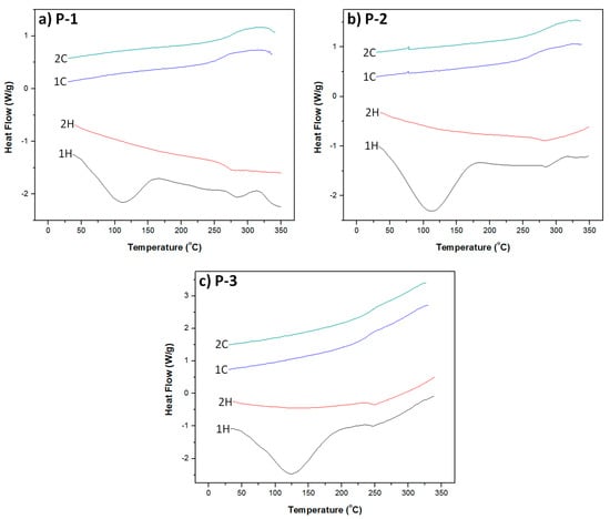 To determine the thermal properties of the ionic polymers, differential scanning calorimetry (DSC) and thermogravimetric analysis (TGA) were performed at heating and cooling rates of 10 °C/min and at a heating rate of 10 °C/min in nitrogen, respectively. The DSC thermograms of ionic polymers P-1, P-2, and P-3 are shown in Figure 5. A broad endotherm at 112 °C due to solvent loss was observed in the first heating cycle of the DSC thermogram of P-1 (Figure 5a), while no such endotherm was observed in the second heating cycle. The high glass transition temperature of P-1—Tg = 276 °C—was evident in its DSC thermograms. However, with further heating, an exotherm was observed after the Tg at 320 °C, which was due to cold crystallization. A glass transition temperature of 275 °C was observed for P-2 (Figure 5b), whereas no cold crystallization endotherm was observed at a higher temperature up to 350 °C. For P-3, a glass transition temperature of Tg = 243 °C was observed (Figure 5c). For triflimide counterions containing ionic polymers P-4, P-5, and P-6, Tg in the range of 230 to 253 °C was observed by DSC analysis. Depending on the chemical structures of the polymers, the Tg ranged from 231 to 275 °C (Table 1). These results indicate that these ionic polymers have high Tg values.