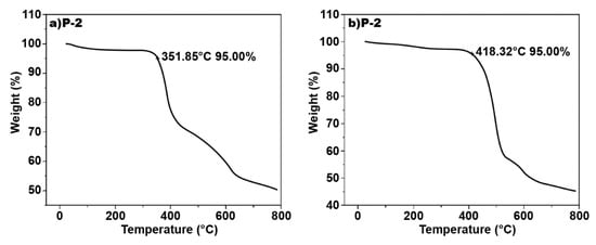 Thermogravimetric analysis (TGA) plots of two representative ionic polymers P-2 and P-4 obtained at a heating rate of 10 °C/min in nitrogen.