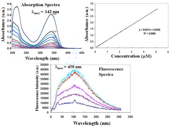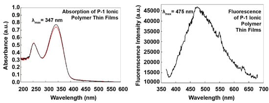 Optical absorption and fluorescence spectra of ionic polymer P-1 in methanol (concentration = 10−6–10−4 M).