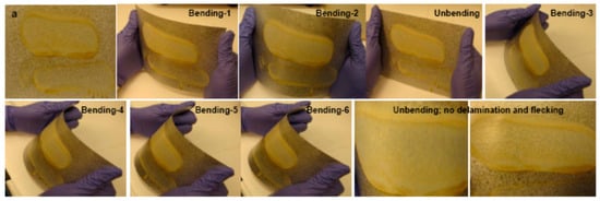 Photographs of bending–unbending of large-area thin films of P-1 on tin substrates prepared by spray coating from methanol solution.