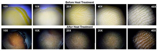 Optical micrographs of thin-films of ionic polymer P-1 before and after heat treatment at 550 °C in air for 30 min at different magnifications.