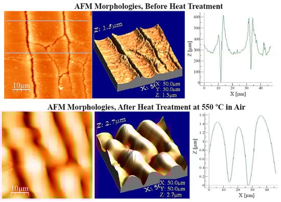 3.6. High-Temperature Heat Treatment and Morphologies of Thin Films
