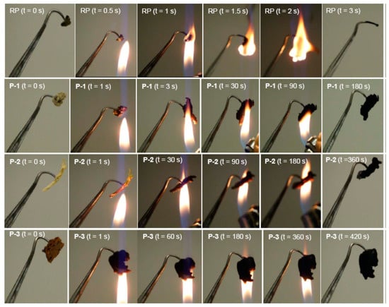 Photographs taken during direct flaming/combustion of a reference polymer (RP; top row) and ionic polymers (P-1, P-2, and P-3) (bottom three rows).