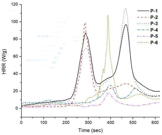 Heat release rate (HRR) of polymers P-1 to P-6 vs. time.