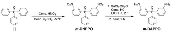 Bis(3-aminophenyl)phenyl phosphine oxide (m-DAPPO) was synthesized by a two-step process (Scheme 2) [96,97]. In the first step, triphenyl phosphine oxide (TPO), II, was reacted with 90% fuming HNO3 and 96% H2SO4 to afford bis(3-nitrophenyl)phenyl phosphine oxide (m-DNPPO). The crude product was dried in vacuum and recrystallized twice from ethanol and obtained m-DNPPO (yield: 65%). Elemental and 1H NMR analyses confirmed the chemical structure and high purity of m-DNPPO. In the second step, bis(3-aminophenyl)phenyl phosphine oxide (m-DAPPO) was prepared by the reduction of m-DNPPO by stannous chloride method [98]. This method was used for the synthesis of this diamine, since the reduction with hydrogen over Pd/C in the hydrogenation shaker produced a low yield of 28% [96]. The solid crude product was filtered, washed with H2O until neutral, and recrystallized from chloroform to give m-DAPPO (yield: 84%). The chemical structure and high purity of m-DAPPO were also confirmed by elemental, 1H, and 13C NMR analyses. DSC thermograms of m-DAPPO were obtained at heating and cooling rates of 10 °C/min in nitrogen. In the first heating cycle, the peak maximum of the melting endotherm was 208 °C, which agrees well with the reported value of the melting point (mp = 203 °C) [96,97].