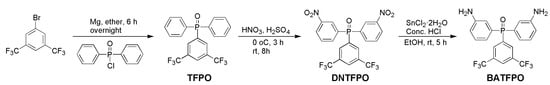 Scheme 3 outlines the synthesis of bis(3-aminophenyl)-3,5-bis(trifluoromethyl)phenyl phosphine oxide (BATFPO). This diamine was synthesized via the Grignard reaction prepared from 3,5-bis(trifluoromethyl)bromobenzene with diphenylphophinic chloride, followed by nitration and reduction reactions [98,99]. The solid crude product was filtered and washed with the copious amount of water until neutral, which gave a crude product of BATFPO, and was air-dried. Then, it was further purified by sublimation to afford pure BATFPO (yield 86%). 1H and 13C NMR spectra and elemental analyses confirmed its chemical structure and purity. It showed a Tm at 228 °C with ΔH = 9.0 kcal/mol in the first heating cycle of the DSC thermogram (lit. mp = 226–227 °C) [99].