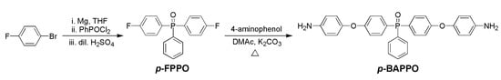 The third diamine compound bis(4-aminophenoxy-4-phenyl) phenyl phosphine oxide (p-BAPPO) was synthesized in a two-step method (Scheme 4). First, bis(4-fluorophenyl)-phenylphosphineoxide (p-FPPO) as an off-white solid with a yield of 89% and mp = 128–130 °C was prepared by reacting p-bromofluorobenzene with phenylphosphonic dichloride in the presence of magnesium in tetrahydrofuran (THF) [100]. In the second step, p-FPPO was reacted with 4-aminophenol in the presence of K2CO3 in N,N-dimethyl acetamide (DMAc) to afford p-BAPPO. The crude product was finally purified by column chromatography over silica gel eluting with 2% methanol/98% ethyl acetate (v/v) to furnish p-BAPPO as an off-white solid powder with 82% yield. The chemical structure was confirmed by 1H and 13C NMR and DSC analyses (mp = 98–100 °C) [100].