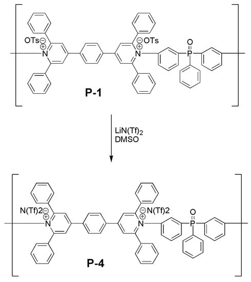 Ionic polymer P-4 was prepared by the metathesis reaction of ionic polymer P-1 with lithium triflimide in DMSO (Scheme 6) [42,43,44,45,46,47,48,49,50,51,52,53,54,55] First, 1.40 g (1.21 mmol) of polymer P-1 was dissolved in 50 mL of DMSO. To the DMSO solution of polymer P-1, lithium triflimide (0.73 g, 2.54 mmol) was slowly added. The resulting solution was kept at 50 °C for 48 h on continuous stirring. After reducing the volume of DMSO solution by a rotary evaporator, the reaction mixture was added to distilled water, affording the desired ionic polymer P-4. It was collected by vacuum filtration, washed several times with a large quantity of hot distilled water, and dried in vacuum at 100 °C for 72 h and weighed to give 1.58 g (1.50 mmol) of polymer P-4 (yield 95%). Anal. Calcd. for C62H41N4O9F12S4P (1373.24): C 54.23, H 3.01, N 4.08, S 9.34; found: C 54.41, H 3.19, N 4.02, S 9.05.