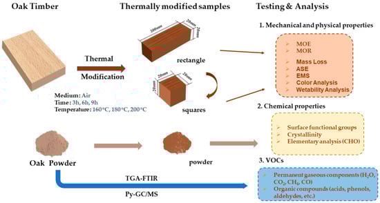 White Oak (Quercus alba L.) was used for the thermal modification experiment; samples were purchased from Treessun Flooring Co. Ltd., Huzhou City, Zhejiang Province, China. The Oak was first cut into different sizes, depending on the different test methods, such as a dimension of 300 mm × 20 mm × 20 mm (L × W × H) for the test of bending strength, 30 mm × 20 mm × 20 mm (L × W × H) for the test of shrinkage, and powder with particle sizes between 220 to 280 meshes for the test of the release of VOCs. Before the thermal modification experiment, the sample was packaged inside sealed plastic bags and stored in a dryer at room temperature. The flow diagram of the wood thermal modification experiment is shown in Figure 1. The statistical analysis (standard deviation and p-value) of all physical and mechanical properties of TM wood are listed in Tables S1–S7 (Supplementary Materials).