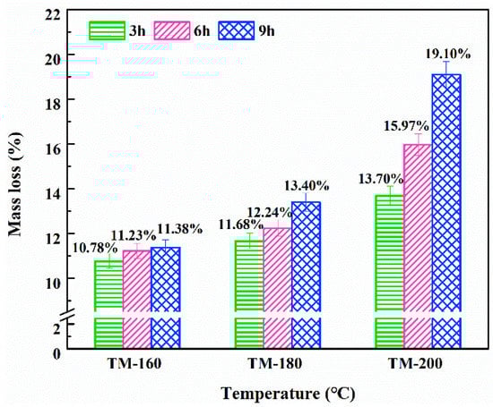 The effect of TM on mass loss (ML) is shown in Figure 2. The results showed that higher temperatures and longer durations led to an increase of ML, ranging between 10.78% and 19.10%. In addition, temperature had a more remarkable influence on ML than duration. This result was confirmed by other researchers [7]. Srinivas et al. found that ML gradually increased from 3% to 18% with an increase of temperature and duration of TM from 210 °C and 2 h to 240 °C and 8 h, respectively [41]. Wang et al. also reported that ML reached its maximum value of 18.1% under the severest TM conditions, i.e., 190 °C and 6 h [42]. In the low temperature range (<160 °C) of TM, the mass loss was a consequence of the evaporation of free and hydroscopic water [17]. However, at higher temperatures (>160 °C), the mass loss was mainly due to the thermal degradation of hemicellulose [3]. This was caused by the fact that hemicellulose showed the lowest thermal stability among the three biomass pseudo components (cellulose, hemicellulose, and lignin) within a temperature range of 100–365 °C [28]. The mass loss in wood transfers into other small molecular weight components, such as CO, CO2, H2O, CH4, and VOCs, etc.
