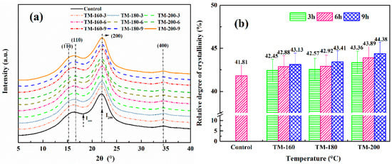 and 110), monoclinic cellulose Iβ (200), and the glucan chains of cellulose (400) [43]. The most remarkable variation was observed in the peak of monoclinic cellulose Iβ (200); the intensity of this peak slightly increased with the increase of temperature and duration, indicating an increase in the crystallinity index (CrI) of cellulose. This result was caused by the thermal degradation of part of the hemicellulose and the rearrangement of cellulose molecules in the amorphous region [42,44]. As shown in Figure 3b, the value of CrI increased from 41.81% in the control sample to 44.38% of TM-200-9. Other references also reported the similar conclusions [5,45]. Okon et al. reported that CrI increased from 38.83% to 63.78% of the control sample from an oil heat treatment at 210 °C and 8 h [5]. Wang et al. also found that the CrI increased from 55.55% of the control sample to 63.33% after TM treatment at 190 °C and 6 h [42]. The decrease of the amorphous region in cellulose would result in a decrease of hydroxyl (–OH), leading to a significant reduction in the hygroscopicity of wood after TM [46].