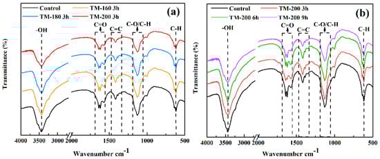 The ultimate analysis (C, H, and O element) of the control and TM wood is shown in Table 1. The content of H and O was slightly decreased with an increase of the severity of TM. Fox example, the content of H and O decreased from 6.01% and 47.26% of TM-160-3 to 5.92% and 45.84% of TM-200-9, respectively. The reduction of H and O strongly supports the conclusion that a series of dihydroxylation (−OH) reactions occurred during the TM process, resulting in an increase in dimensional stability [3,53]. However, the content of C increased from 46.74% of TM-160-3 to 48.14% of TM-200-9 [54]. Boonstra et al. also found that the content of C slightly increased from 49.6%, in non-treated samples, to 50.6% in TM samples at 180 °C [3].