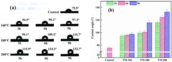 The wettability of TM samples was evaluated by the contact angle, where a large contact angle corresponded to greater hydrophobicity and better dimensional stability [55]. Figure 5a shows the pictures of the contact angle testing process. Higher TM temperatures and longer durations would result in round-shaped water droplets on the surface; otherwise, flatter shapes were observed, since the liquid was rapidly absorbed, leading to small contact angles [56].