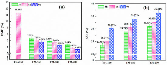 Figure 6a shows the effect of TM on the equilibrium moisture content (EMC). Compared to the control sample, the EMC of thermally-modified samples was markedly decreased. Meanwhile, increasing the severity of TM would result in a lower value of EMC, decreasing from 7.39% of TM-160-3 to 5.59% of TM-200-9. The decrease of wettability was caused by the elimination of hydroxyl (–OH) linked on hemicellulose and the reduction of the amorphous region of cellulose, which reduces hydrogen bond interactions between the hemicellulose/cellulose and the water from the humid atmosphere [2,3,58].