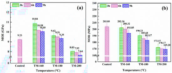 However, the MOE firstly increased from 9.23 GPa of the control sample to 10.84 GPa of TM-160-9, and then gradually decreased to 7.64 GPa of TM-200-9 (shown in Figure 7a). Similar results were obtained in studies conducted by Guo et al. and Yildiz et al. [62,63]. Guo et al. studied the effect of TM on the mechanical properties of white poplar (Populous tomentosa.). The results showed that the MOE firstly increased by 13% after TM at 200 °C for 1 h, before decreasing by 9% after TM at 250 °C for 5 h [62]. The increase of MOE at 160 °C and 180 °C was mainly due to the increase of the crystallization of cellulose and condensation of lignin via cross-linking reactions with furfural produced from the thermal degradation of hemicellulose [15,42,64].